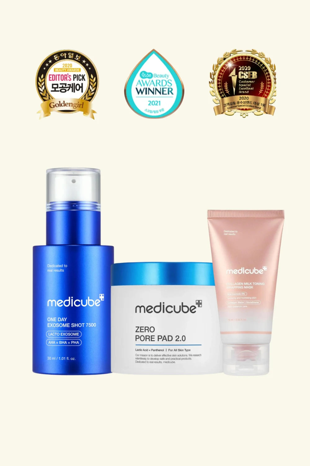 Prep with Medicube Zero Pore Pad 2.0 → Apply Medicube One Day Exosome Shot Pore Ampoule 2000 → Seal with the Collagen Milk Toning Wrapping Mask for a firming, glow-boosting routine.